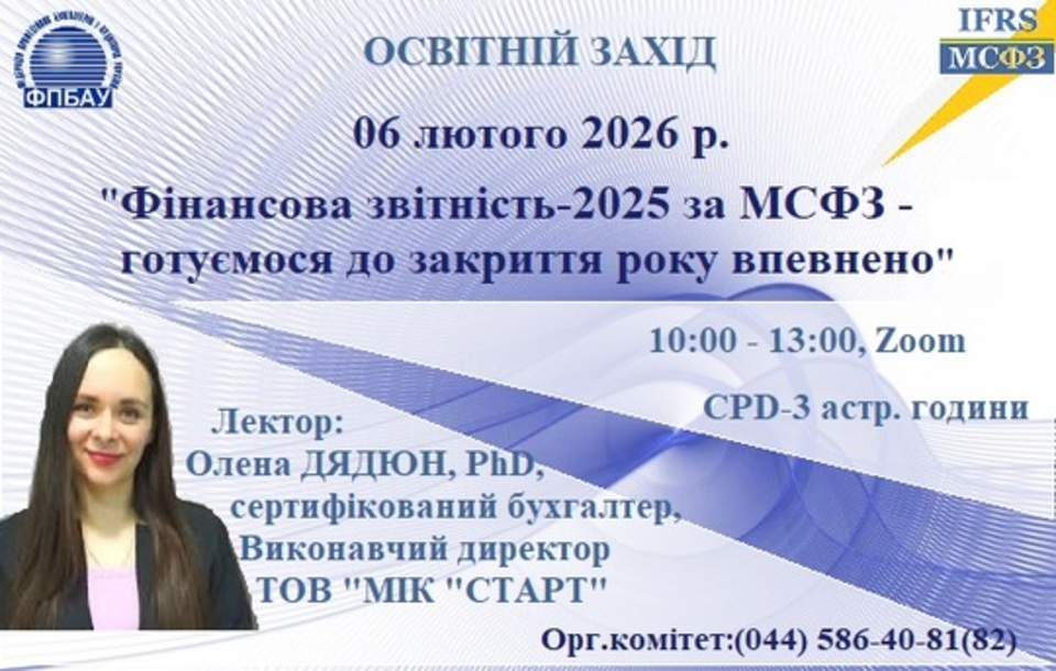Освітній захід постійного професійного навчання за темою: "Фінансова звітність-2025 за МСФЗ - готуємося до закриття року впевнено" Онлайн захід відбудеться 06 лютого 2026 р., з 10:00-13:00, CPD-3 астр. години, в Zoom Організатор: Федерація професійних бухгалтерів і аудиторів України »12.12.2025 Новини